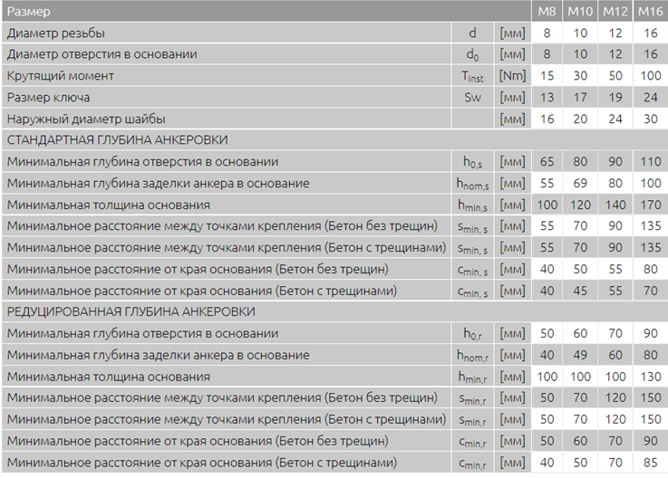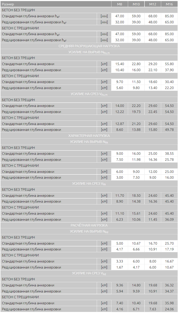 Лучшие параметры в бетоне с трещинами и без трещин, которые подтверждены в Европейской технической оценке ЕТА, опция 1